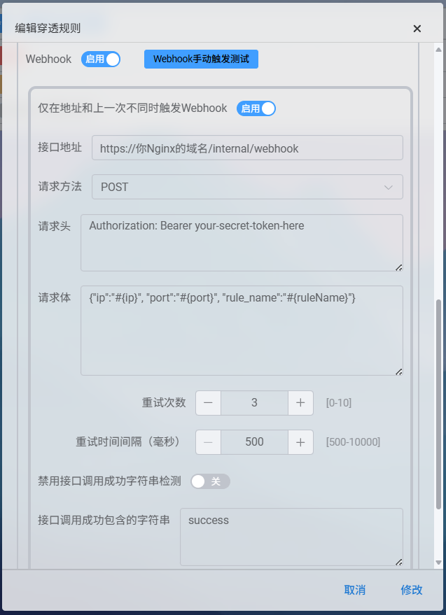 {"ip":"#{ip}", "port":"#{port}", "rule_name":"#{ruleName}"}填写完成后点击 Webhook手动触发测试 来验证配置是否正确。
